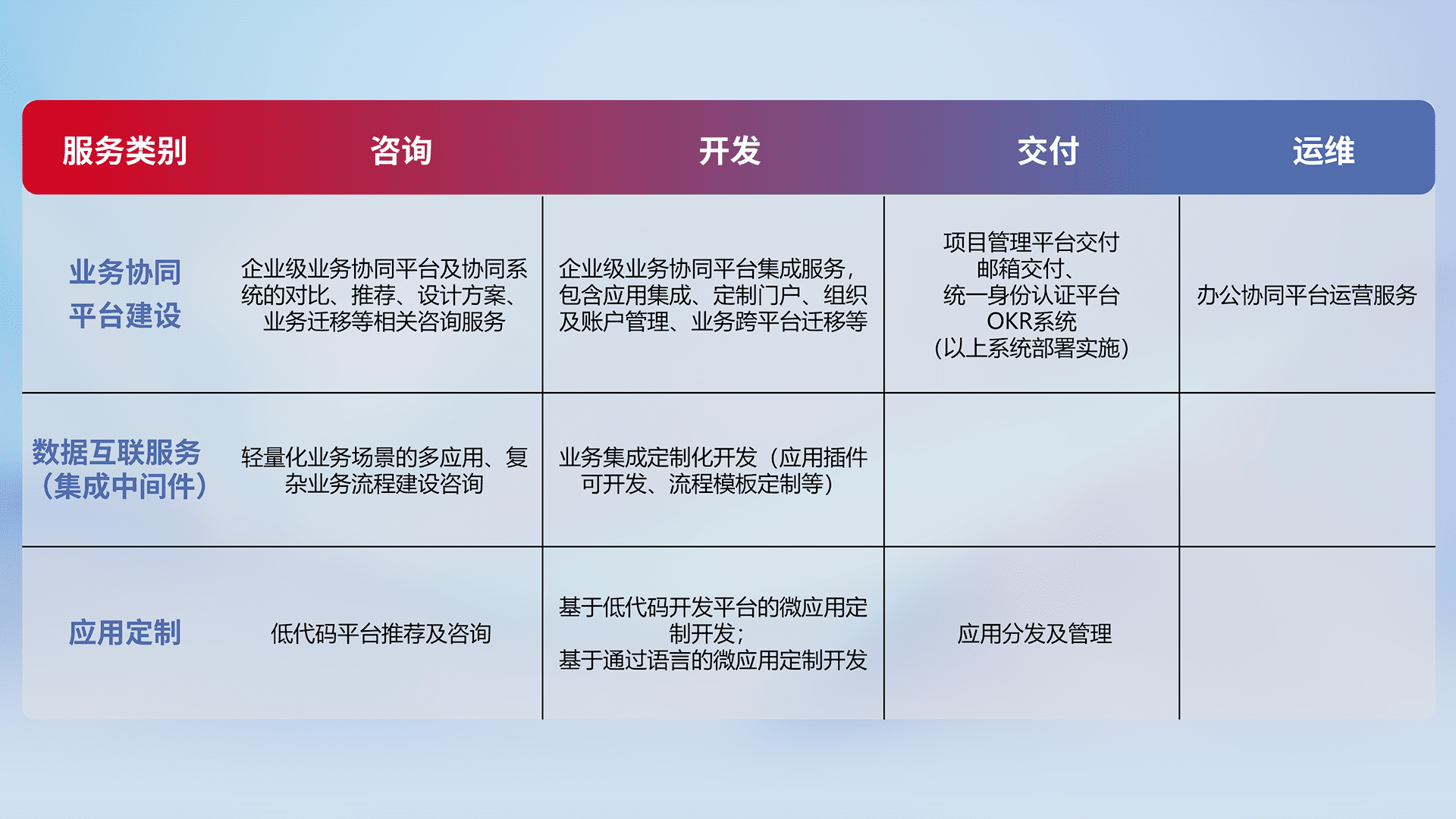 针对钉钉、、企微、、、、IDaas等平台级产品提供产品的规划、、、方案、、、、交付、、定制化开发等服务,,,,实现如统一协同办公、、、智能客户服务、、、混合会议管理、、、、智能数据查询、、等业务场景,,,实现数字化转型。。