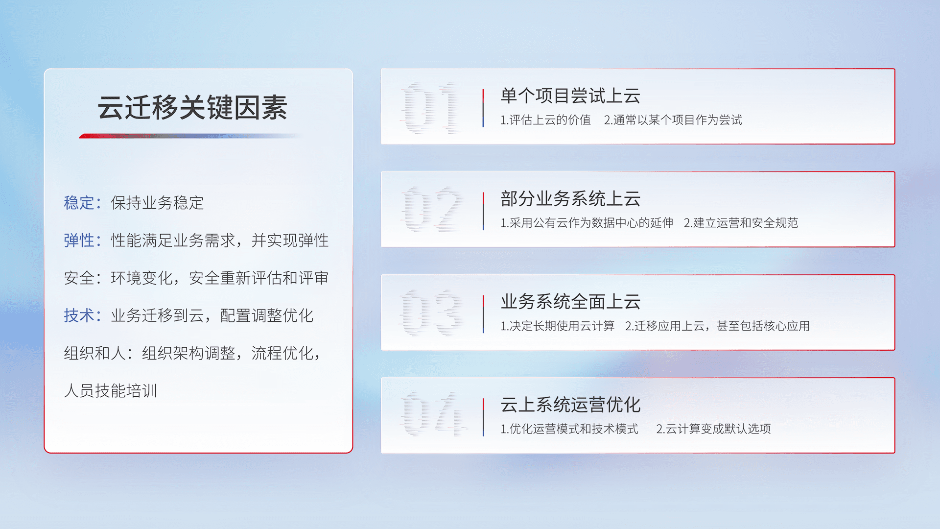 结合实际业务,,,,从规划设计、、、、云平台选型、、、、云原生改造、、数据迁移、、、集成交付,,,,迁移全过程为客户识别最佳上云路径,,,做好风险识别管理,,,设计网络架构、、、身份权限、、、安全审计合规、、、操作审计、、、、日志审计、、、监控告警策略、、、、多站点容灾设计等,,对云上基础设施进行整体规划,,,,提升IT治理水平,,以满足弹性、、高可用、、高性能的需求。。
